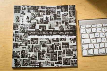 El catálogo «Cuatro décadas del rostro de la plástica 1972-2011», con el teclado como referencia de escala. ©Francisco Cubas