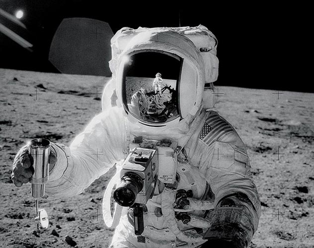 ¿Te has preguntado alguna vez qué tan difícil fue para los astronautas tomar esas famosas fotografías? Yo no, hasta que investigué un poco para este texto, pero debí de habérmelo preguntado mucho antes. Después de todo, estaban metidos en esos enormes trajes, sin gravedad, con la cabeza dentro de un gran casco circular. En esa época no había auto enfoque ni auto exposición. Las cámaras modificadas no llevaban visor (sería inútil con los cascos puestos). Pero como sabemos, la NASA concentra en su seno a casi todas las personas inteligentes de Estados Unidos (lo cual explica muchas cosas), así que lo tenían todo pensado.