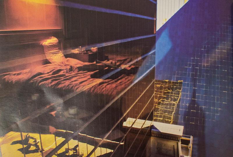 4.- De nuevo el reflejo en los espejos, en la primera imagen, para acentuar la simulación, la ficción de un cuarto de hotel empotrado en una pirámide «egipcia». La segunda foto es una toma del domo del Caesar’s Palace por donde desfilan a toda hora la noche, el día, el atardecer. Nuevamente, realidad simulada. Podemos apreciar claramente como ambas fotos se complementan en formas y en el uso del rojo y el azul, que además son los dos colores dominantes de toda la serie.